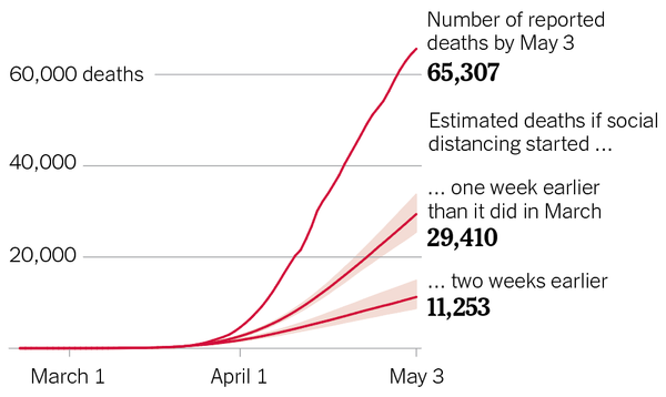 If the measures had been in place two weeks earlier, on March 1, the death toll would be 54,000 lower.